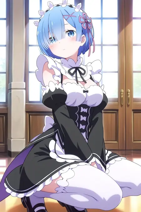 服装:发饰,x发饰,女仆,Roswaal庄园女仆制服,头环,女仆头饰,颈带,黑色颈带,荷叶边,长袖,分离袖,裙子,黑色裙子,围裙,过膝袜,白色过膝袜,鞋子,黑色鞋履,丝带,发带,丝带装饰,黑色丝带,