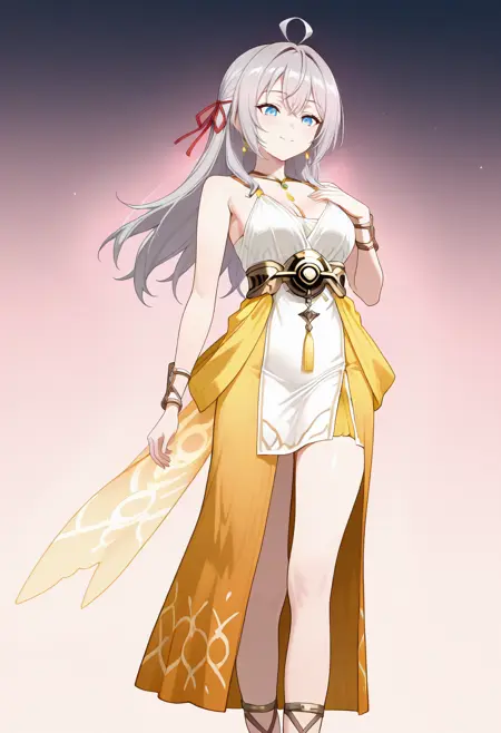 cha9-v1,1girl,solo,dress,white dress,fantasy dress,layered clothes,yellow accents,wing pattern,cleavage,halterneck,flowing fabric,bare shoulders,gold jewelry,ornate belt,tassel,jewelry,gladiator sandals,anime screencap,