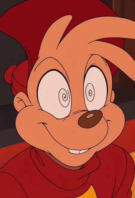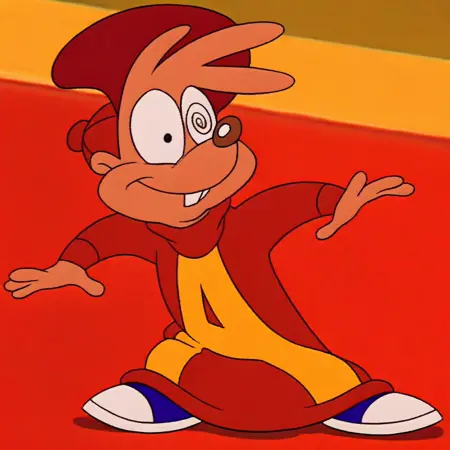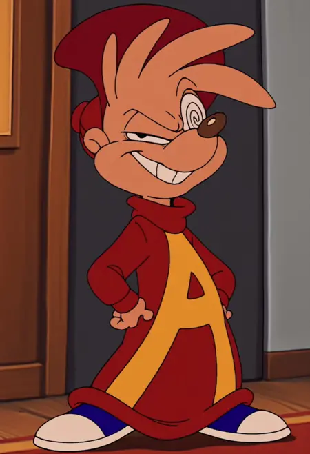 Prompt: Alvin Cartoon monster, solo, 1boy, chipmunk, brown nose, left spiral eye, right brown eye, brown fur, red baseball cap, red sweater with a yellow 'a', turtleneck, blue shoes