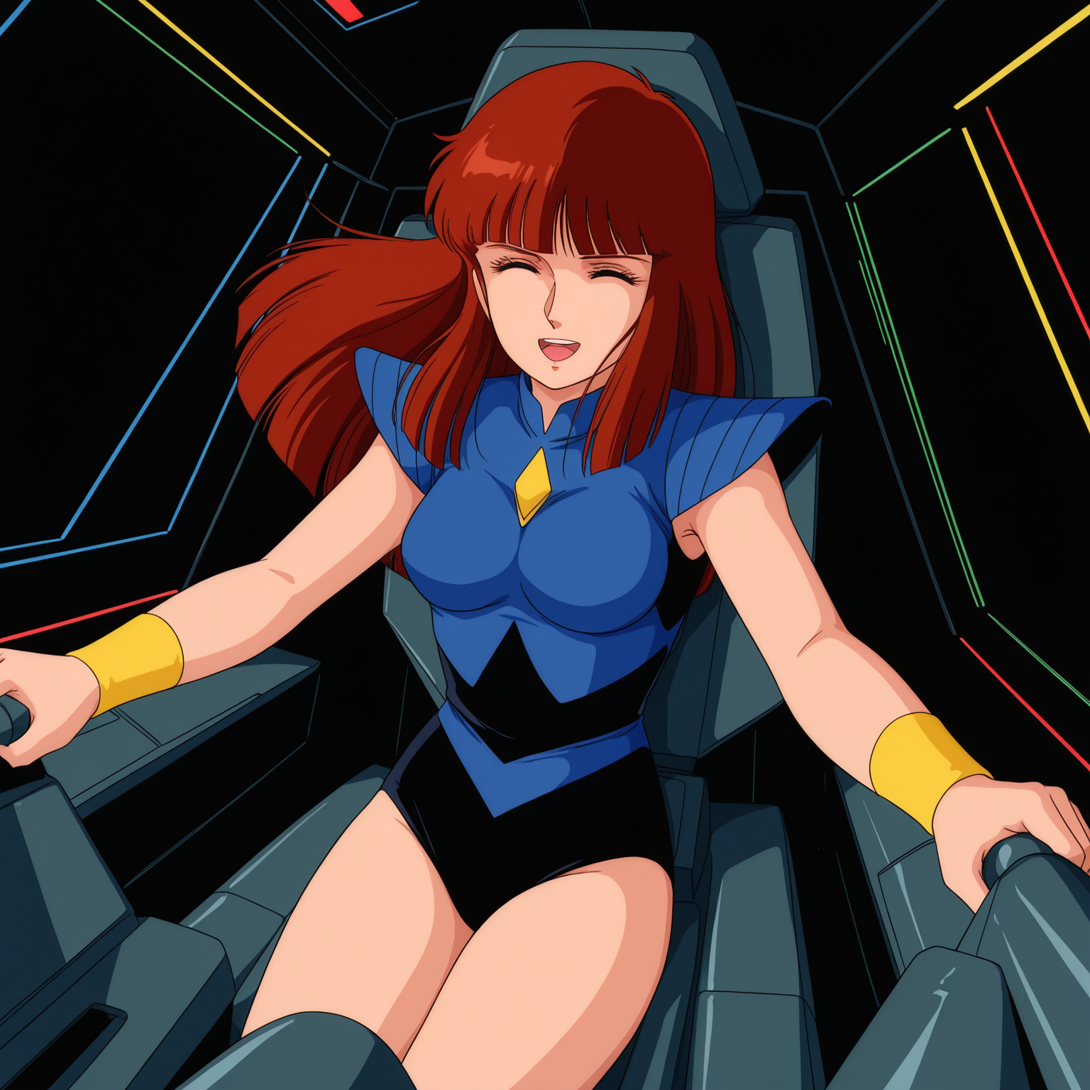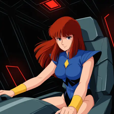 brown hair, long hair, blunt bangs, blue eyes, medium breasts,