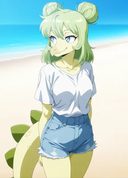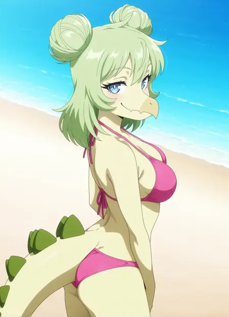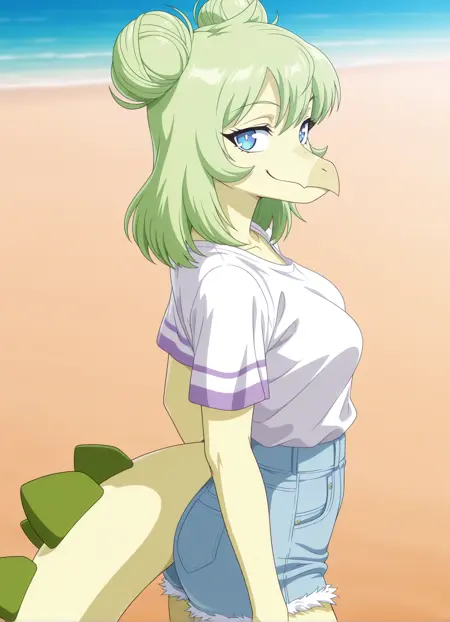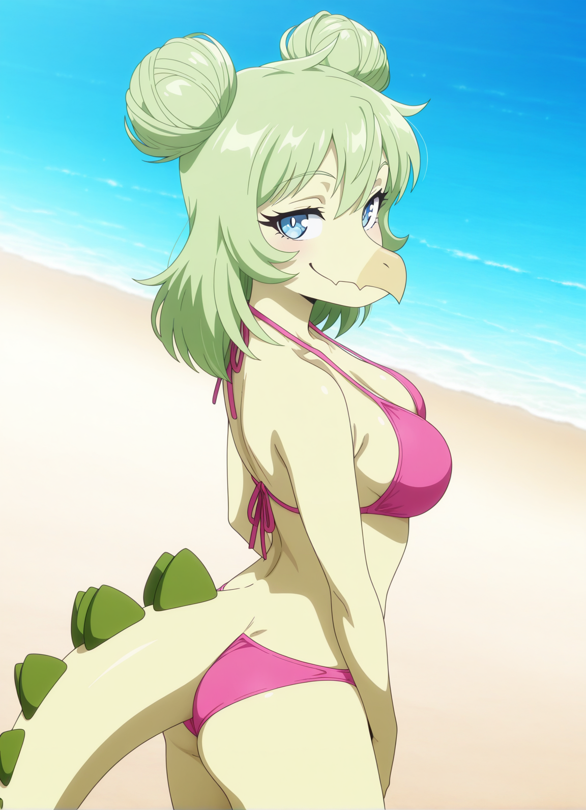 Stella, dinosaur girl, furry female, spreading legs, smiling, green skin, green hair, hair buns, blue eyes, tail