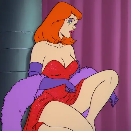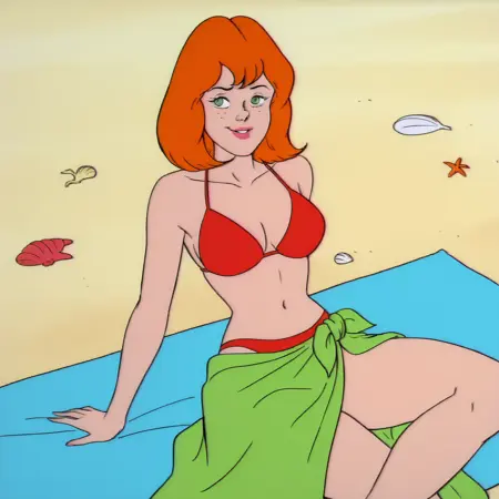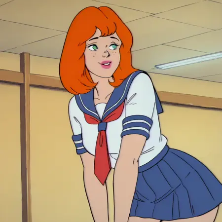 orange hair, green eyes, purple short dress, green sash, blue cape