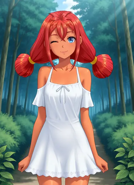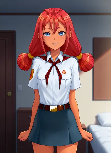 Ulyana: svus, blue eyes, red hair, low twintails, long hair, tan