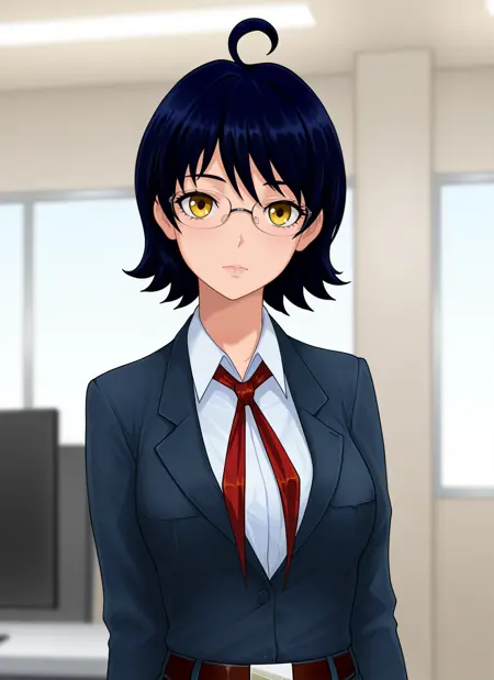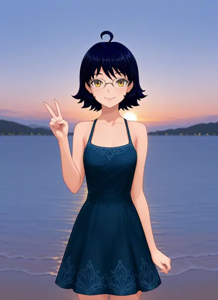 Zhenya: zhmz, yellow eyes, dark blue hair, short hair, ahoge, glasses