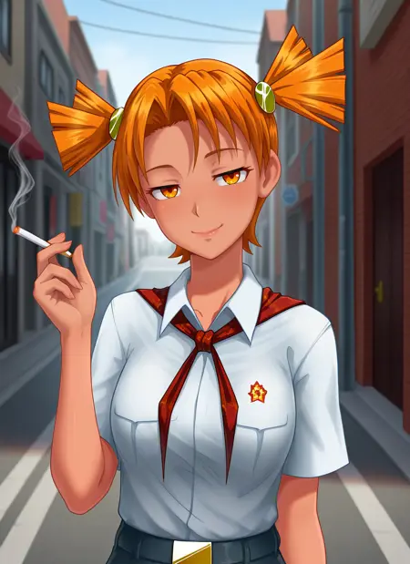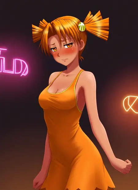 Alisa: aldv, orange eyes, orange hair, twintails, hairpin // you might want to use 'red eyes' with orange eyes for better results