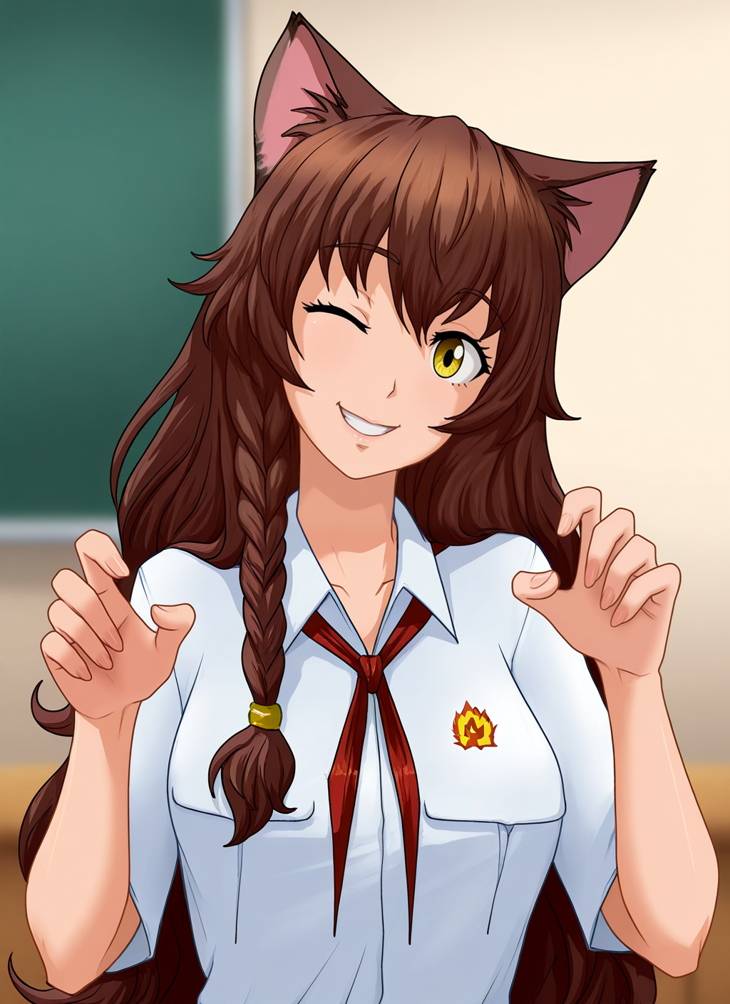 Uvao: uluv, yellow eyes, brown hair, long hair, cat ears, side braid