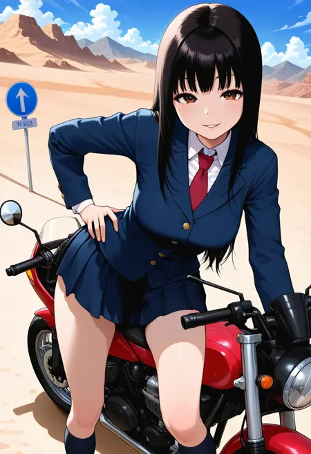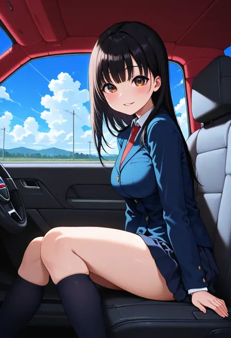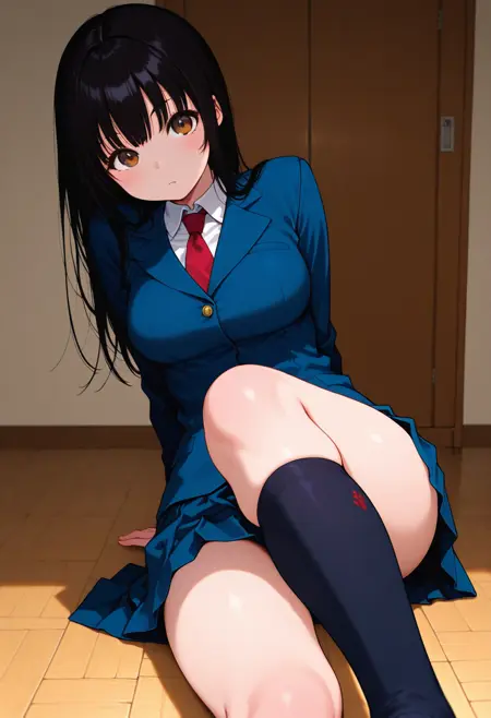- kosakuraww, brown eyes, black hair, long hair, straight hair, medium breasts,