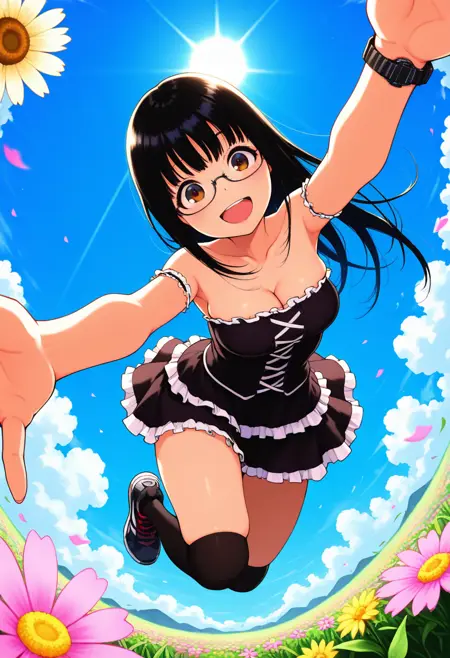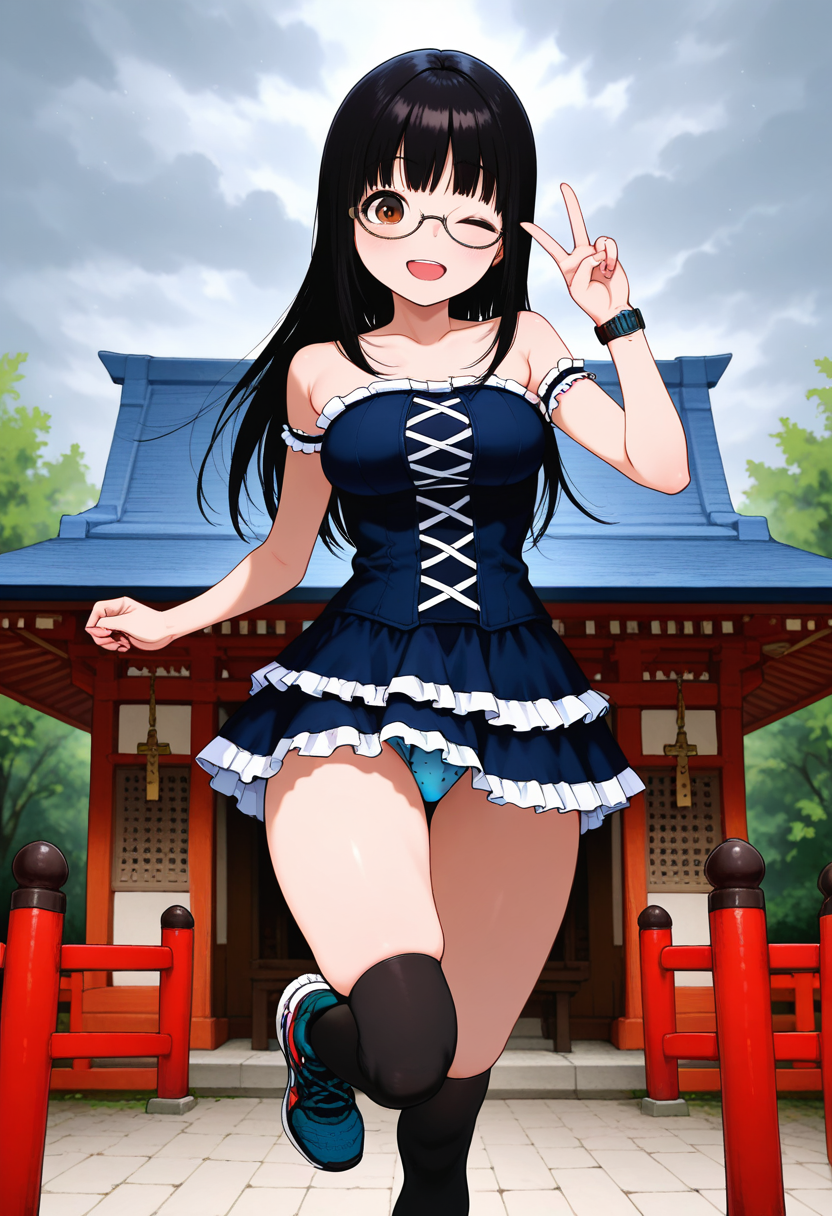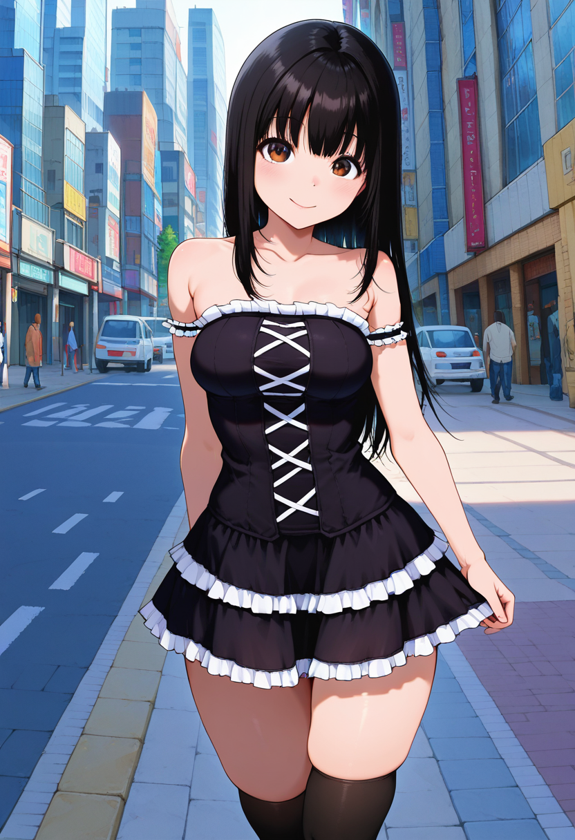 cross-laced clothes, strapless dress, frilled dress, layered dress, short dress, frilled armband, zettai ryouiki, over-kneehighs, sneakers,