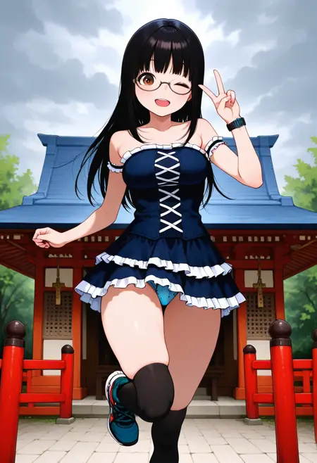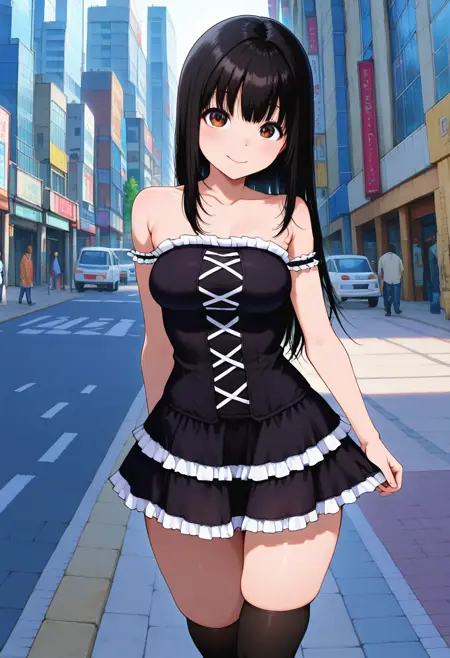 크로스 레이스 의상, 스트랩레스 드레스, 프릴 드레스, 레이어드 드레스, 짧은 드레스, 프릴 팔찌, 제타이 료우키, 허벅지보다 긴 양말, スニーカー,