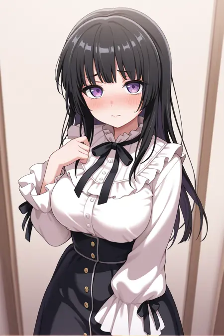 shirokanerinko, 1girl, solo, black hair, long hair, looking at viewer, purple eyes, skirt, frills, long sleeves, ribbon, black skirt, shirt, bangs, high-waist skirt, frilled sleeves, blush, white shirt, neck ribbon, hairband, breasts, bow, black ribbon, standing, cslsk