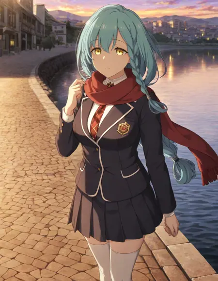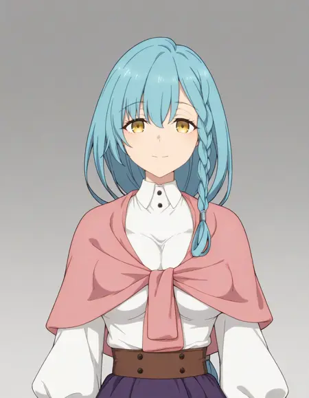 <lora:rose_marblehart-katainaka_no_ossan_s1-v2-ixl-anime-soralz:1>, 로즈 마블하트 (카타이나카 노 오사난), 긴 머리, 아쿠아 색 머리, 옆머리 땋기, 땋은 머리, 노랑색 눈