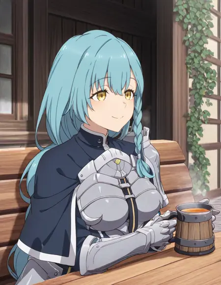 <lora:rose_marblehart-katainaka_no_ossan_s1-v2-ixl-anime-soralz:1>, rose marblehart (katainaka no ossan), 長い髪, 水色の髪, 横編み, 編み髪, 黄色い目