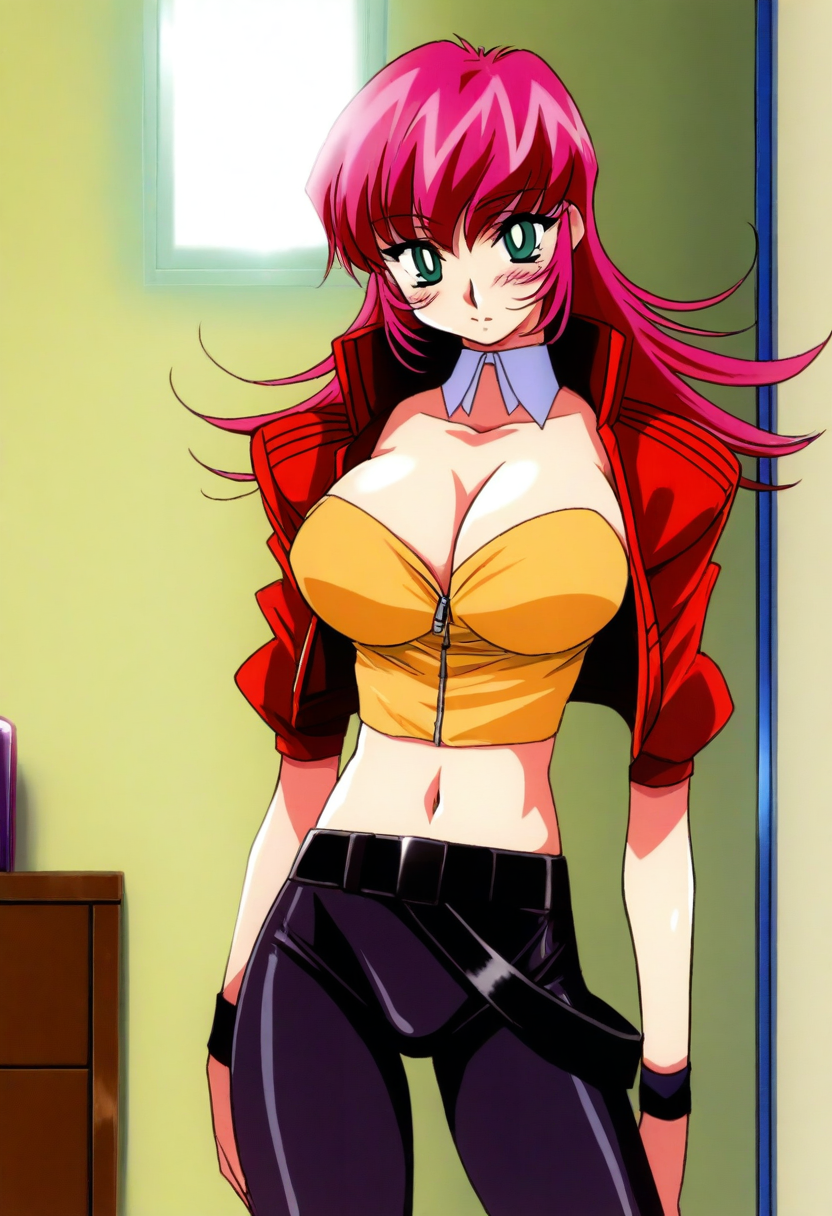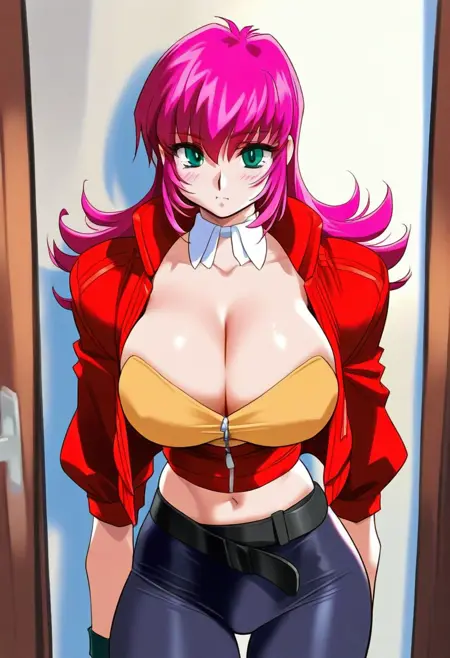 触发词:raikaf40,粉发女性,大乳房,长发,绿眼,松散领子