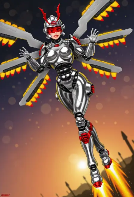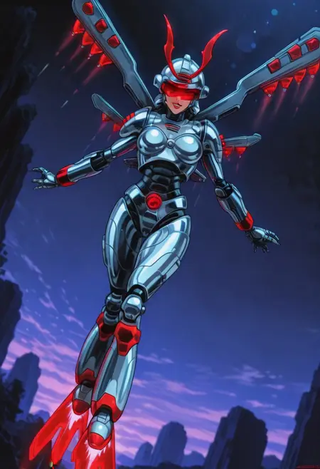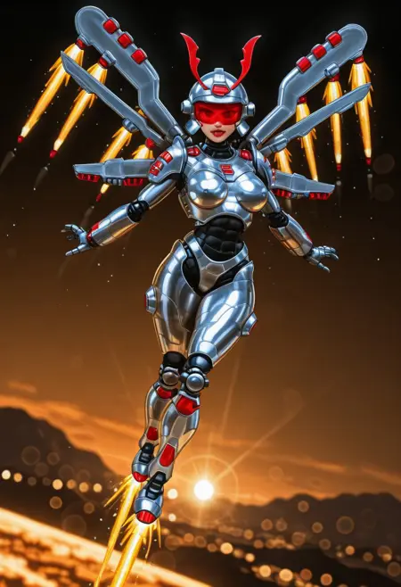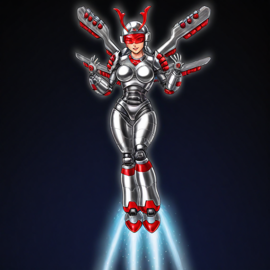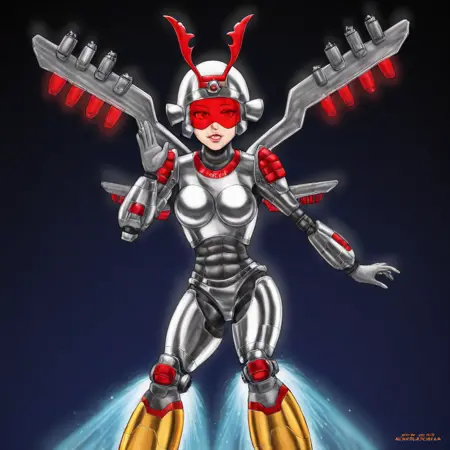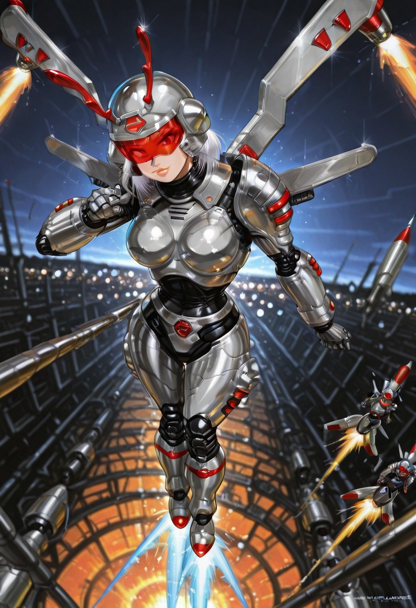 RocketAngelRA, 1소녀, 솔로, 메카 머스ume, 메카, 로봇, 은색 갑옷, 빨간 장식, 헬멧, 빨간 시야, 두꺼운 입술, 큰 가슴, 가슴판, 어깨판, 기계 날개, 로켓 엔진, 비행, 안테나, 제트 엔진, 팔찌, 부츠, 장갑,