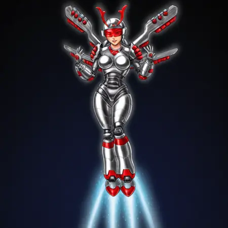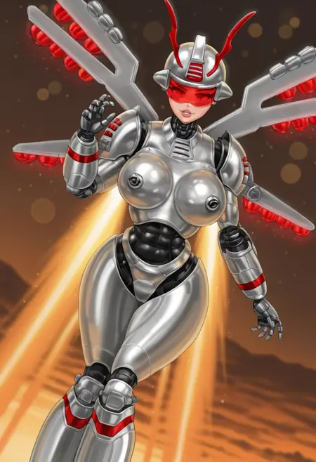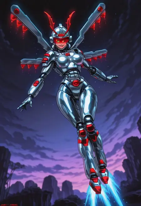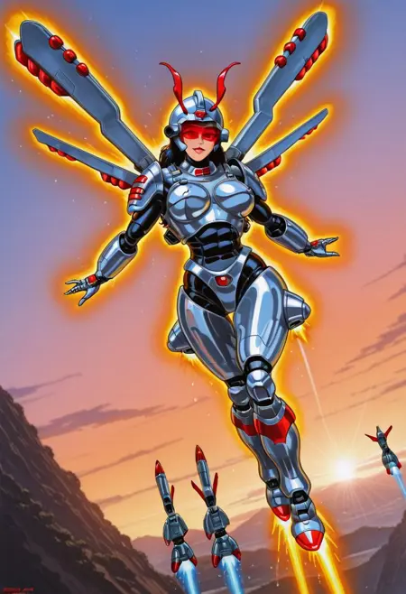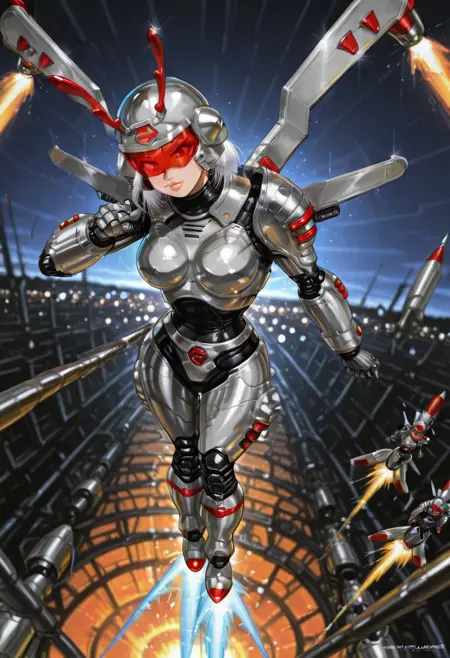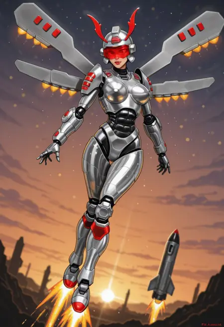 RocketAngelRA, 1girl, solo, mecha musume, mecha, robot, silver armor, red inserts, helmet, red visor, full lips, large breast, breastplate, pauldrons, mechanical wings, rocket engine, flying, antennae, jet engine, bracers, boots, gloves,