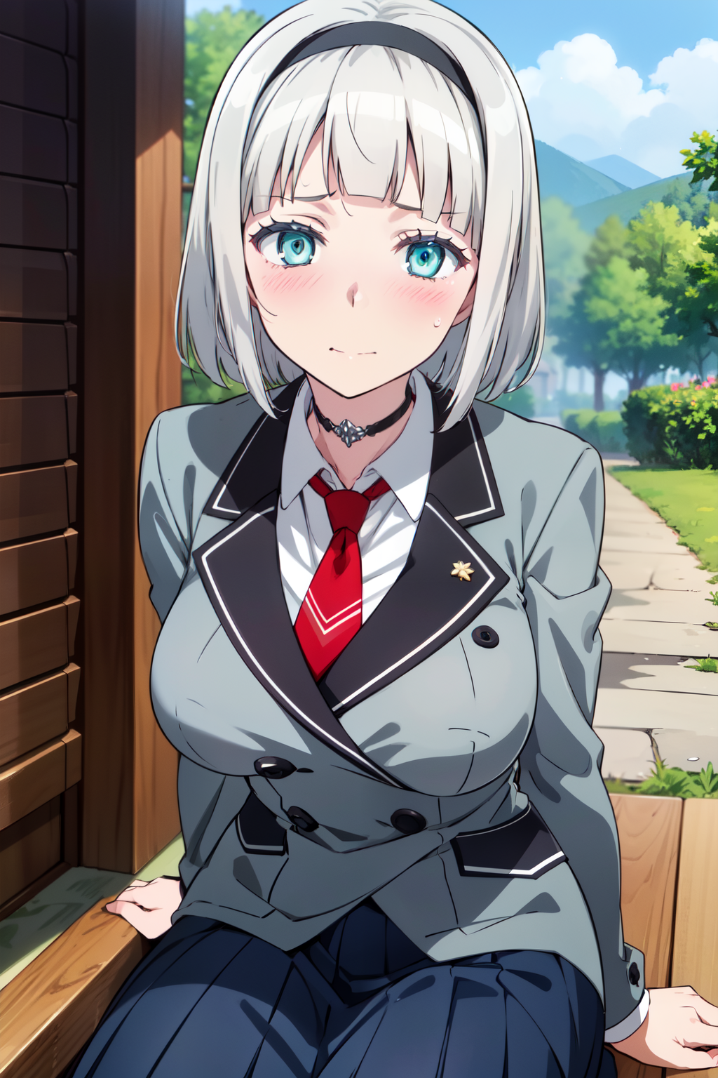트리거 단어: AnnaNishikinomiya, 흰 머리카락, 청록색 눈, 단발, 검은 머리띠, 초커, 큰 가슴, 학교 유니폼, 회색 재킷, 흰 셔츠, 빨간 넥타이, 재킷 단추 잠금, 파란 치마