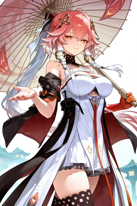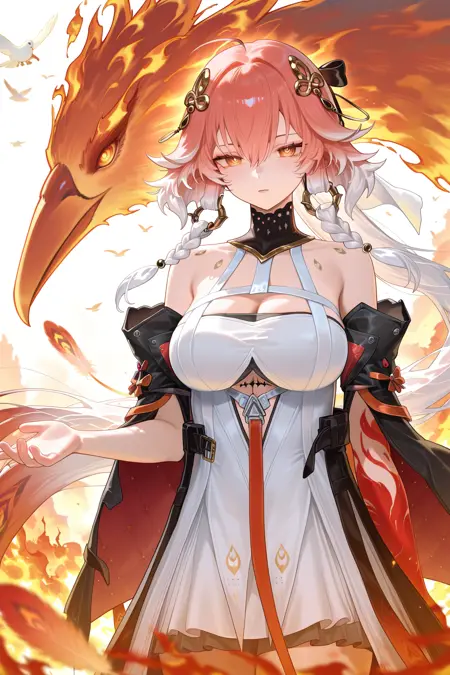 changli \(wuthering waves\),1girl, 粉色头发, 黄色眼睛, 连衣裙, 发饰, 彩色头发, 马尾, 手套, 黑色过膝袜, 白色连衣裙, 裸露肩膀, 大腿绑带, 辫子, 短发带长发束, 长发