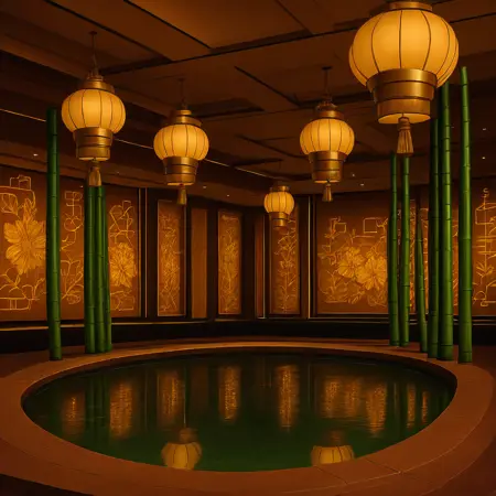 luxury casino interior, red and gold color scheme, ambient golden lighting, symmetrical architecture, modern asian influence, cinematic atmosphere, deep red walls, golden decorative panels, glowing ceiling lights, ornate glass railings, illuminated golden accents, polished black marble floor, art deco elements, dramatic lighting, elegant gaming area, warm color palette, velvet textures, stylized interior design, grand staircase, transparent glass steps, fringe pendant lamps, glossy reflections, indoor slot machine rows, high-end environment, architectural symmetry, luxury hotel vibe, ambient light gradients, dark wood furniture, glowing floor details, upscale lounge design
