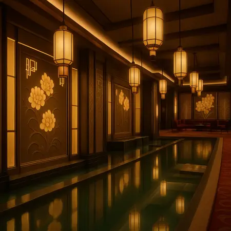 luxury casino interior, red and gold color scheme, ambient golden lighting, symmetrical architecture, modern asian influence, cinematic atmosphere, deep red walls, golden decorative panels, glowing ceiling lights, ornate glass railings, illuminated golden accents, polished black marble floor, art deco elements, dramatic lighting, elegant gaming area, warm color palette, velvet textures, stylized interior design, grand staircase, transparent glass steps, fringe pendant lamps, glossy reflections, indoor slot machine rows, high-end environment, architectural symmetry, luxury hotel vibe, ambient light gradients, dark wood furniture, glowing floor details, upscale lounge design