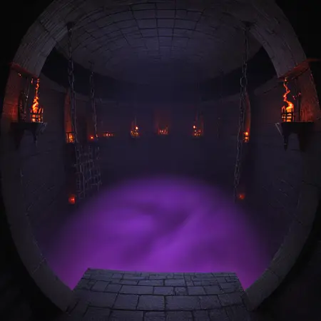- 一貫した質感の詳細:錆びた鎖、粗い石、霧、松明の光