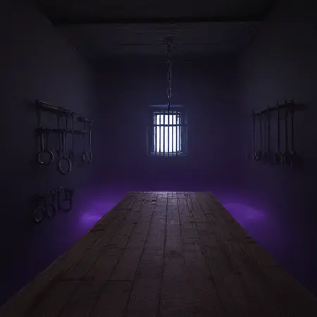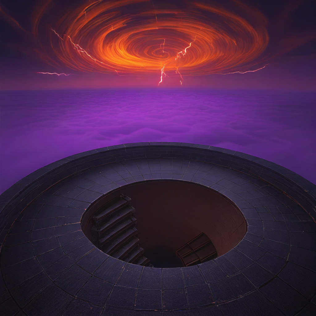 ダークファンタジー環境、写実的照明、超高精細、黒い石造りの建築、要塞デザイン、重い金属補強、不吉な雰囲気、渦巻く紫の霧、血のように赤い空、映画的リアリズム、古代の構造物、影の雰囲気、光る松明の明かり、鉄の鎖、錆びた金属の質感、嵐の雲、魔法の霧、浮遊するプラットフォーム、地底の深さ、冷たい石の壁、異次元の設定、圧倒的な規模、呪われた建築、劇的なコントラスト、不気味な光、輝く雲、高解像度リアリズム、虚空のような風景、超自然的なカラーパレット、神秘的な要塞