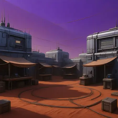 건물은 매끄러운 청회색 강철과 브러시드 크롬으로 구성되어 있으며, 케이블, 지붕 기계, 그리고 변형 가능한 요소들로 연결되어 있으며, 비어 있어도 생동감 있고 기능적인 정착지임을 암시합니다. 주변 풍경은 각진 암석 절벽, 멀리 떨어진 메사, 그리고 붉은 자홍색 하늘 아래 희소한 사막 식물로 이루어져 있습니다.
