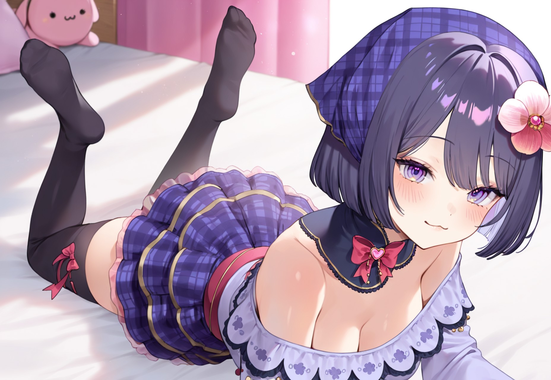1girl, maefae, 紫色头发, 短发, 紫色眼睛, 头巾, 发饰花, 粉色花朵,