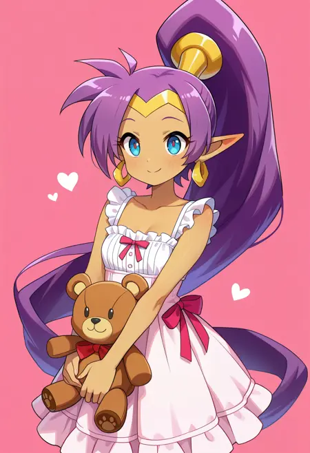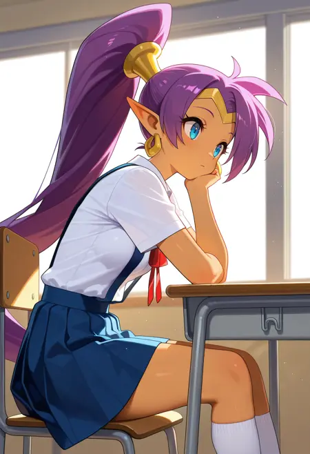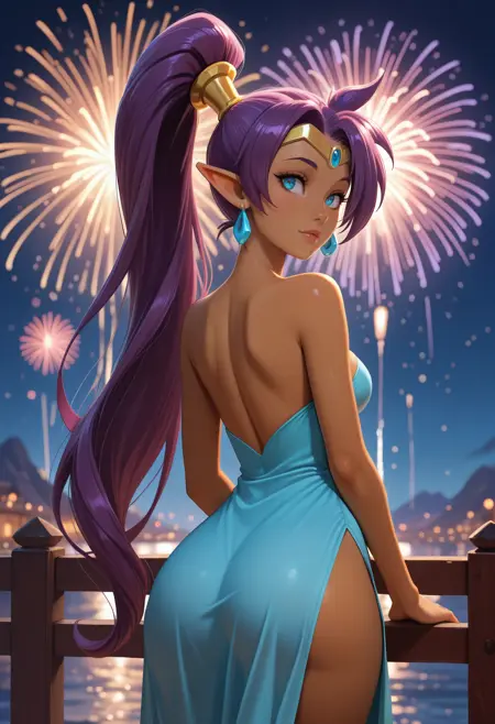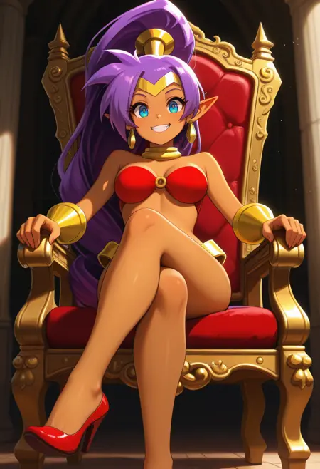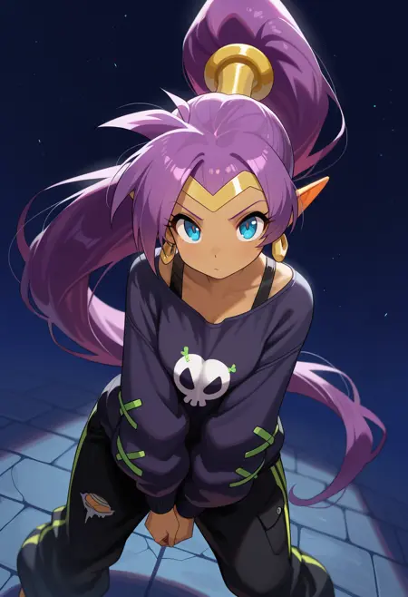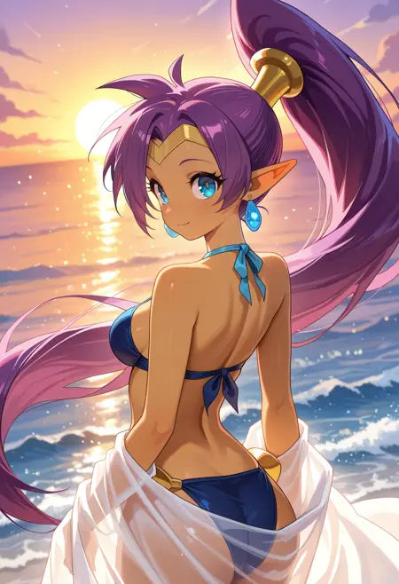 VGShantae, 1girl, pointy ears, dark skin, purple hair, long hair, high ponytail, blue eyes, tiara, loop earrings, jewelry
