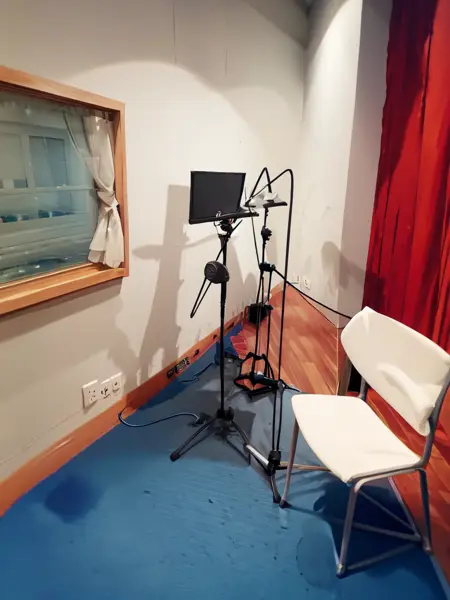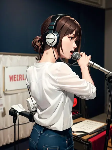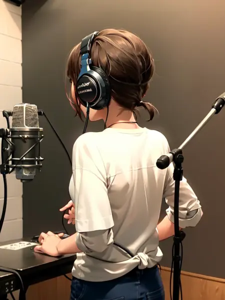 recbooth, solo, microphone, headphones, realistic, brown hair, shirt, cable, white shirt, from behind, microphone, microphone stand