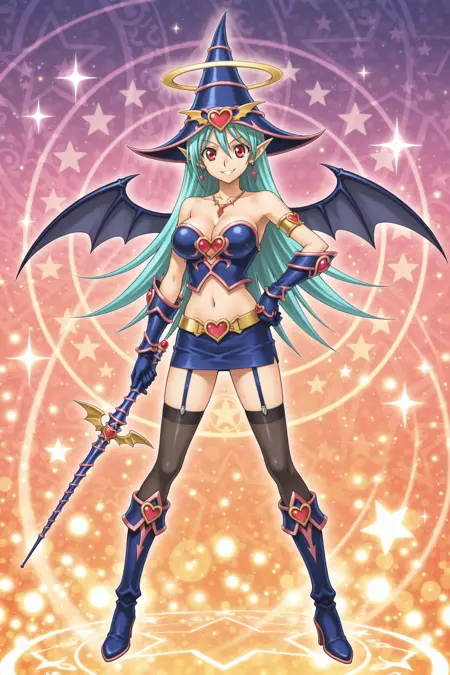 yugioh_card_style, yugioh_card_for_chocolate_magician_girl, red eyes, aqua hair, long hair, pointy ears, earrings, necklace, large breasts, collarbone, navel, cleavage, smile, smile, hand on hip, bare shoulders, armlet, pointed witch hat, gold and red heart emblem, heart-themed accessories, sleeveless top, navy and pink outfit, mini skirt, black thigh-high stockings, gold belt buckle, detached sleeves, armored gloves, bat-wing sleeves, heart-shaped bust ornament, stylized magical armor, blue wand, bat wings, shoulder-attached wings, dark blue wings, high heel boots