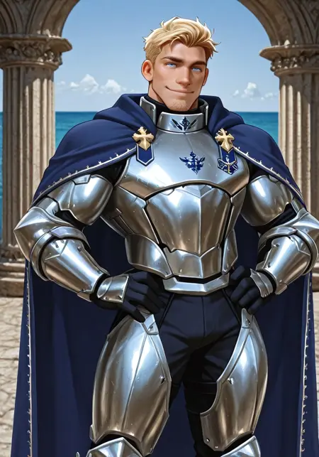 プロンプトには、筋肉質、金髪、青い目、ひげ、シルバーの鎧、ネイビーブルーのマント、青いunderwear、青いジョッキーを含めて、正しい方向に導いてください。