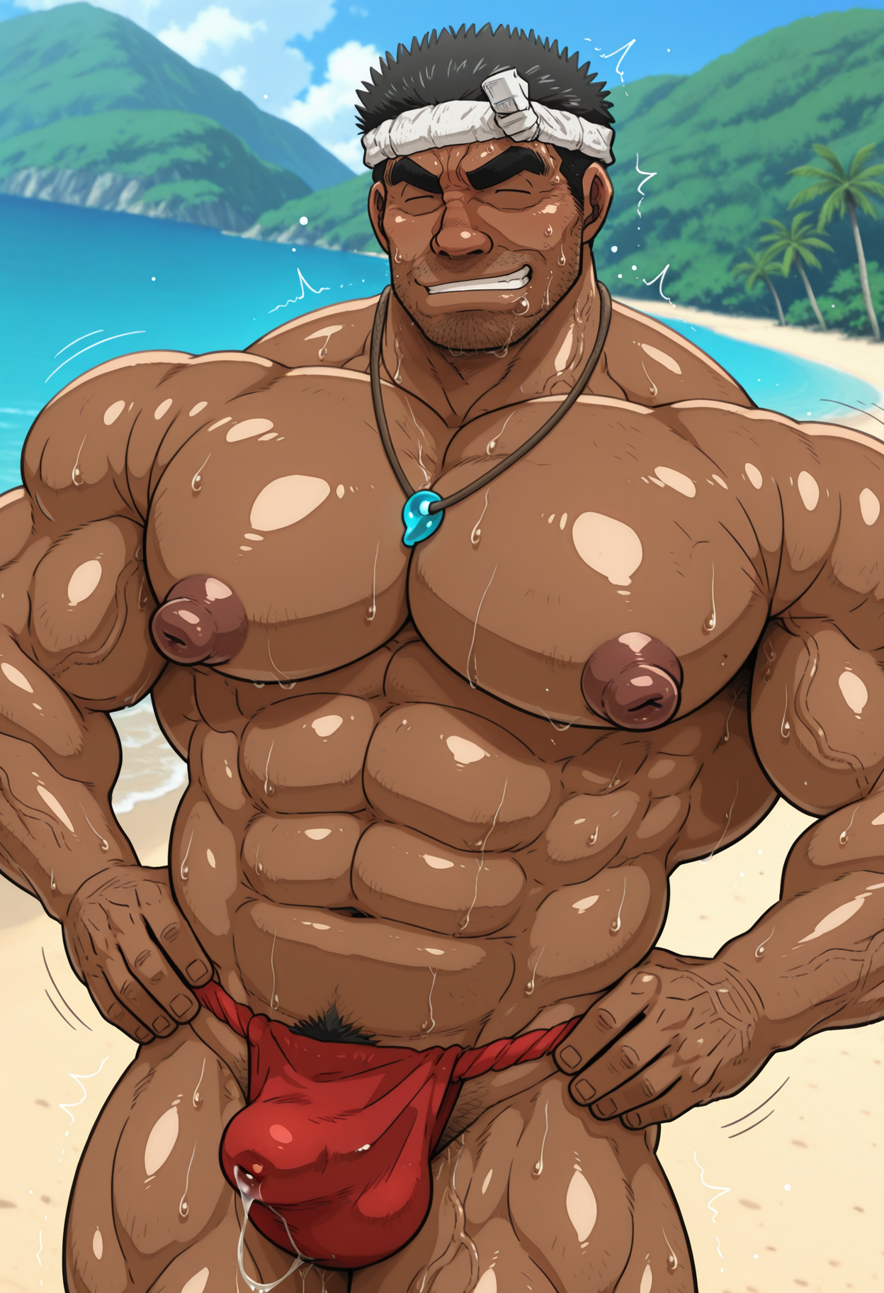Black hair, stubble, thick eyebrows, Dark skin, white headband,