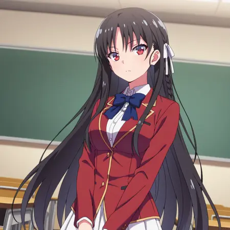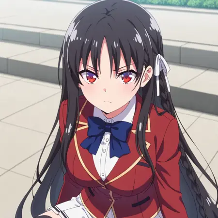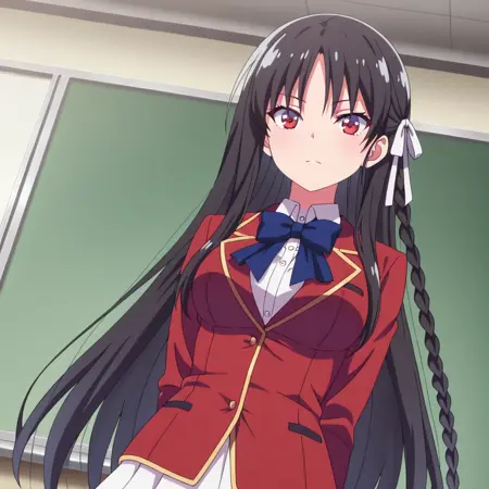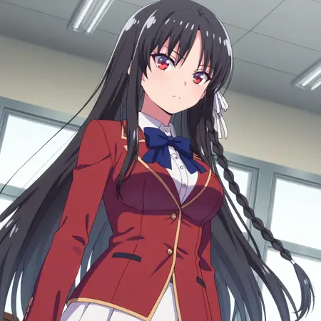 Horikita suzune (Youkoso Jitsuryoku Shijou Shugi no Kyoushitsu e),black hair,very long hair,side braid,red eyes,medium breast,white hairribbon
