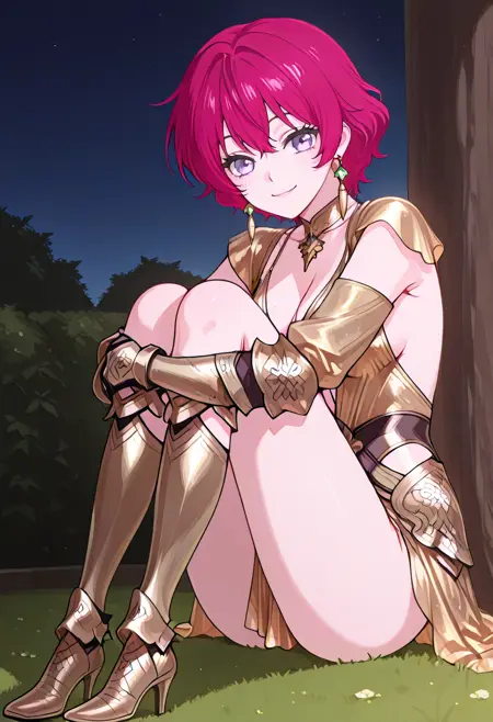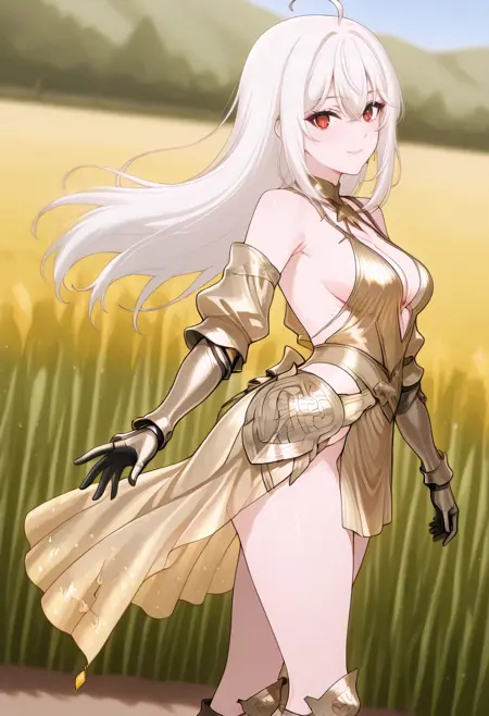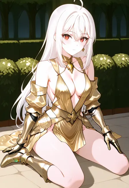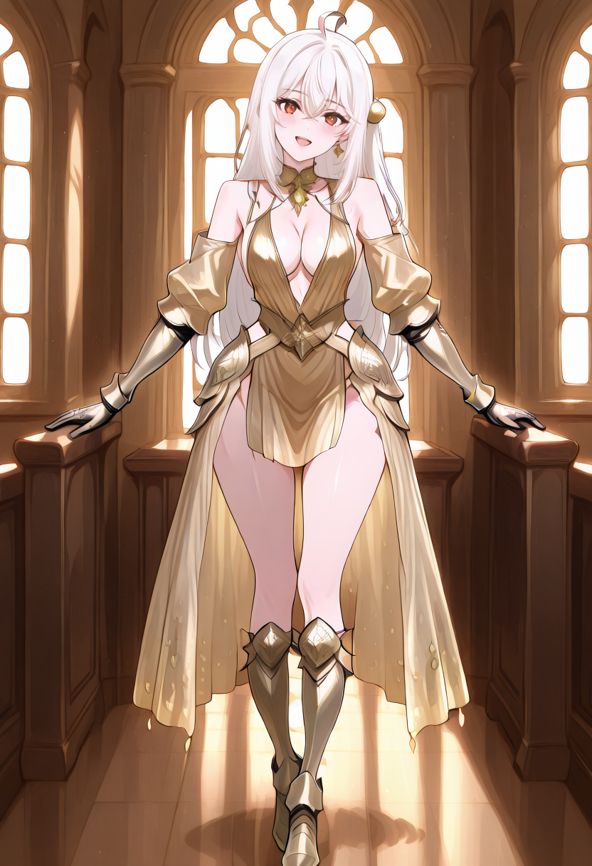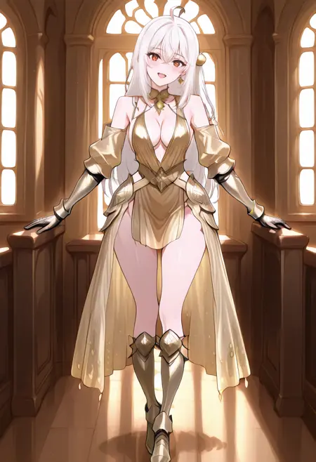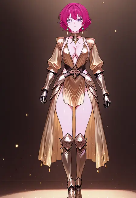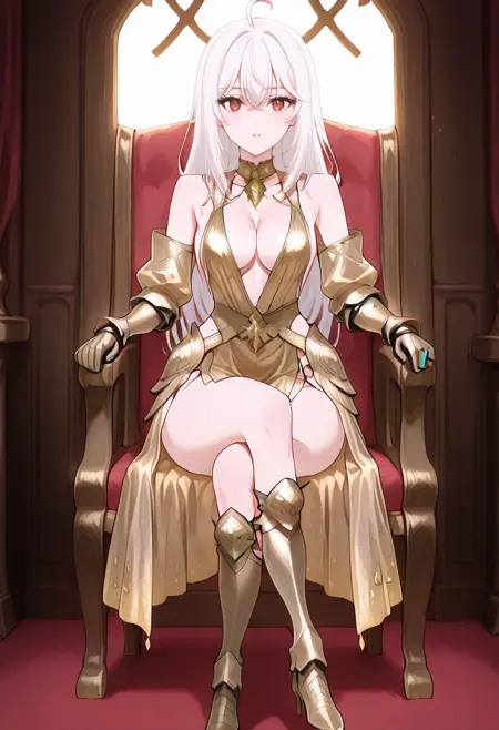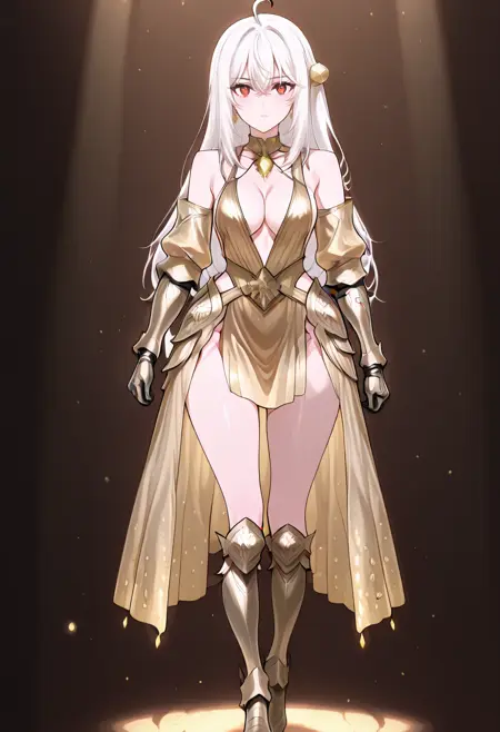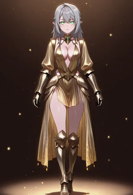 cha10v1,1girl,solo,golden armor,armored dress,low cut,deep cleavage,bare shoulders,exposed back,detached sleeves,gauntlets,thigh-high boots,high heels,thigh slit,golden skirt,high-low skirt,anime screencap