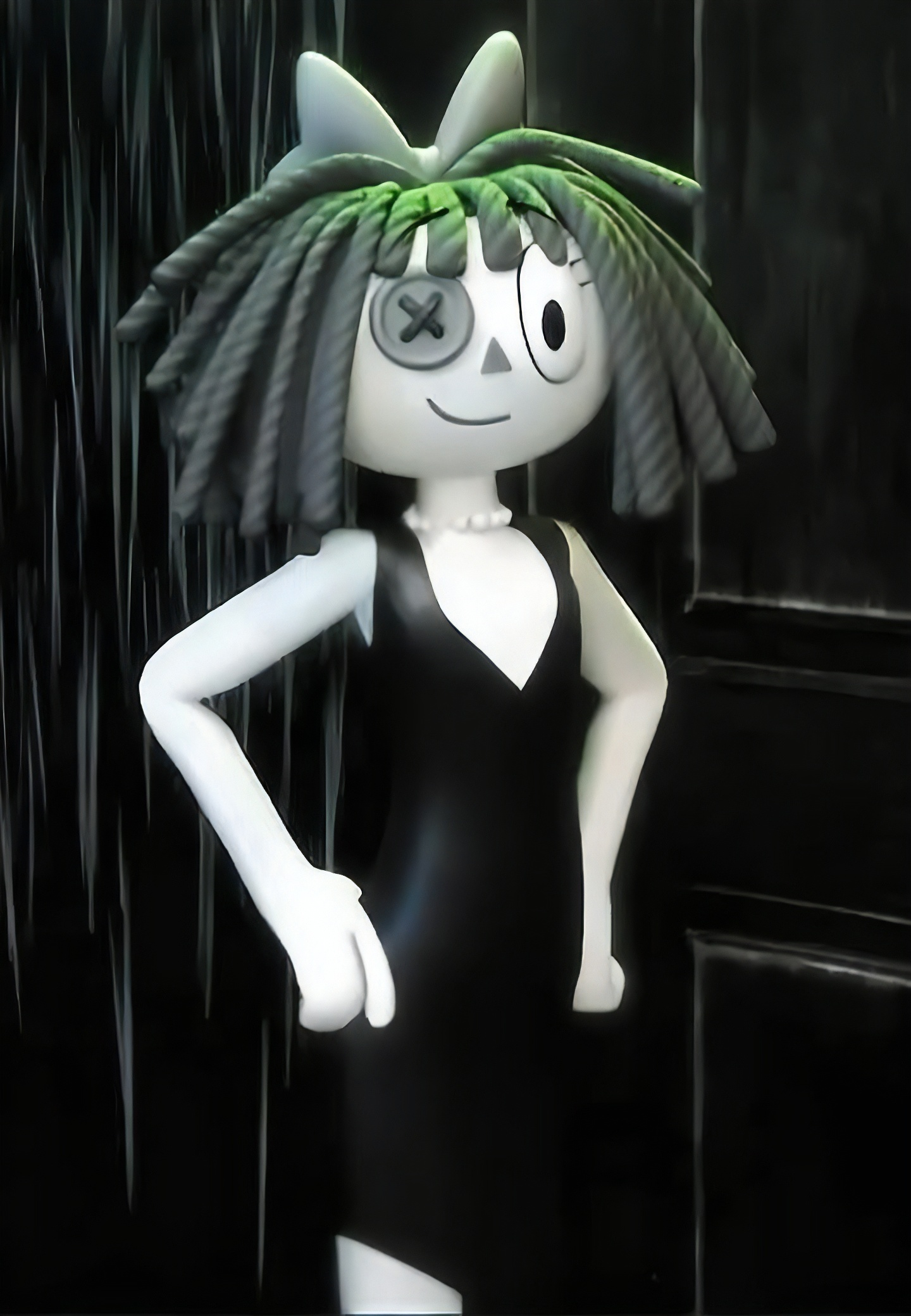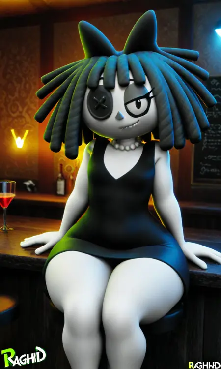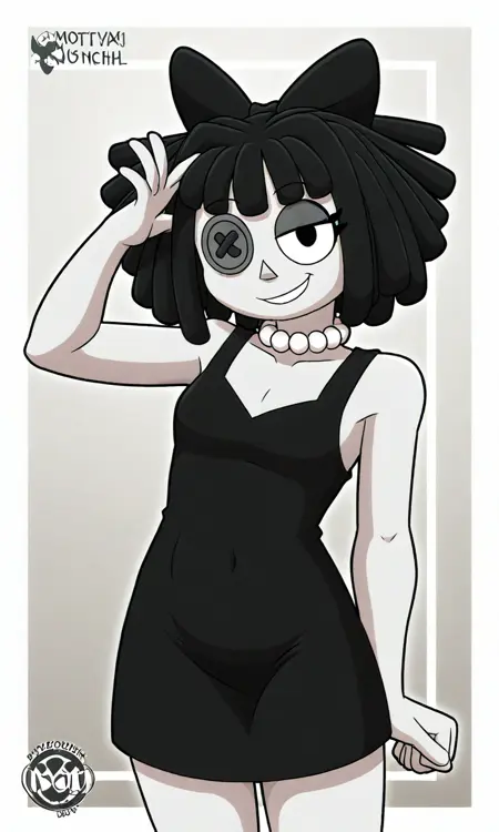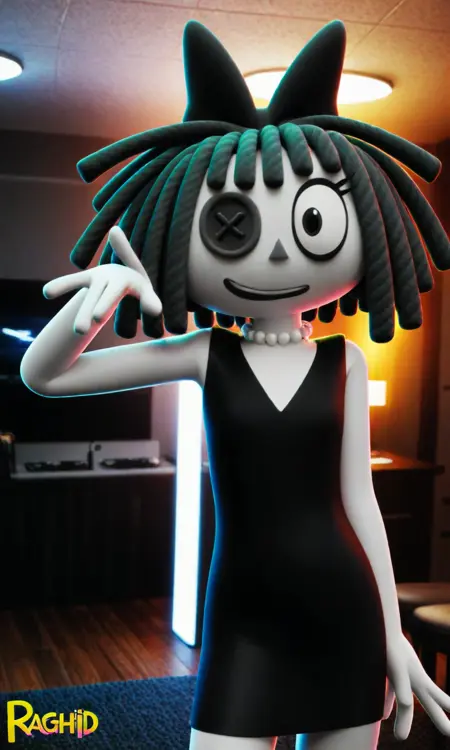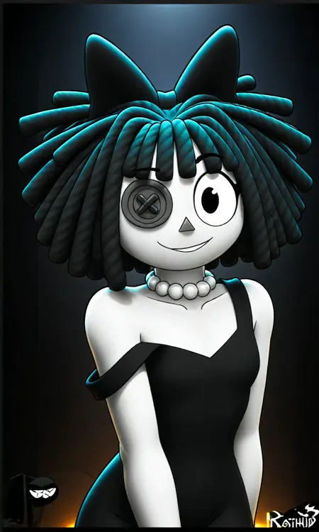 Tags: RagathaBD, red yarn-like hair, Black Eye, flat orange triangular nose, Button Eye, hair Bow, black slip dress, pearl collar neck, noir,