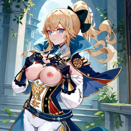 (Genshin_Jean, long hair, ponytail, blonde hair, bangs, blue eyes, hair bow, white pants, capelet, detached sleeves, strapless, gloves, bow, jewelry),
