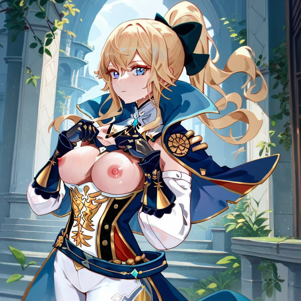 (Genshin_Jean, 긴 머리, 팔자머리, 금발, 앞머리, 파란 눈, 머리끈, 흰 바지, 카프레트, 분리형 소매, 스트랩리스, 장갑, 활, 보석),