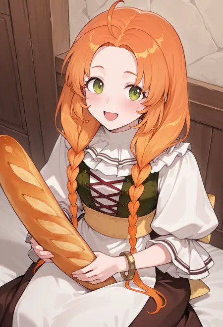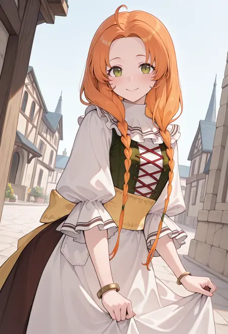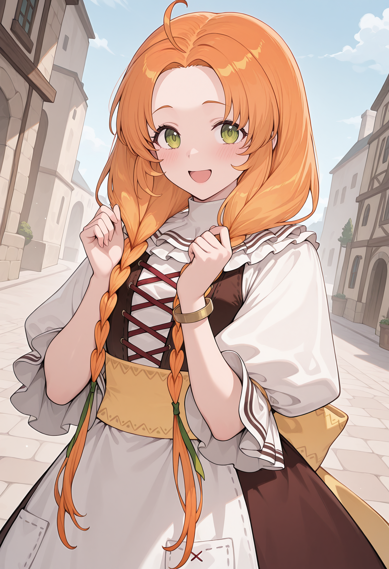 atschia,橙色头发,金色头发,长发,双马尾,绿色眼睛,呆毛,发丝垂肩,