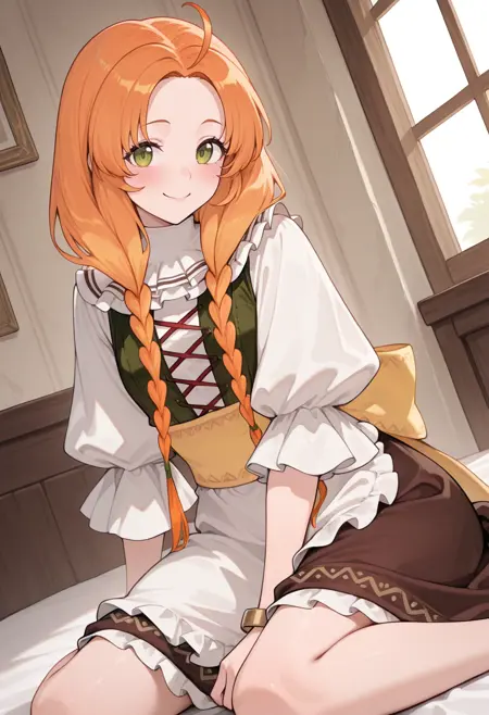 atschia, 주황색 머리, 금발, 긴 머리, 더블 브레이드, 녹색 눈, ahoge, 어깨에 내린 머리,