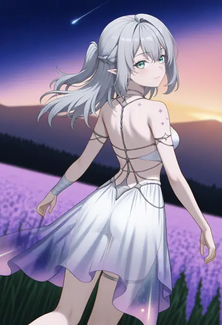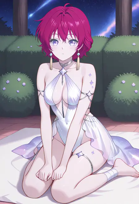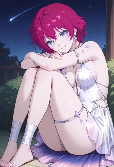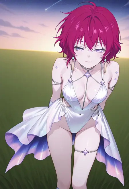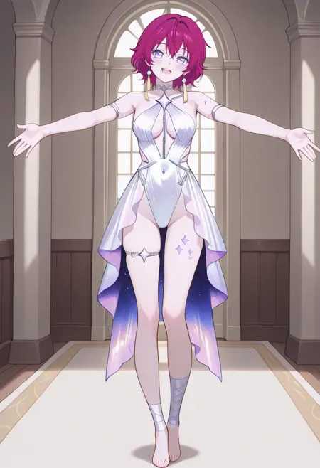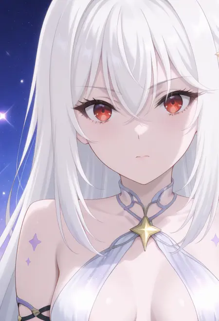 cha12v1,fantasy,ethereal,white dress,galaxy print,gradient skirt,bare legs,highleg,deep cleavage,bare feet,backless,arm straps,leg wraps,star motif,see-through dress,thigh strap,anime screencap