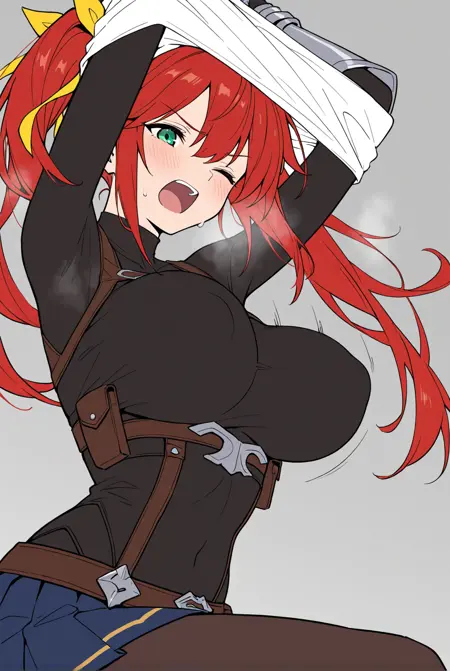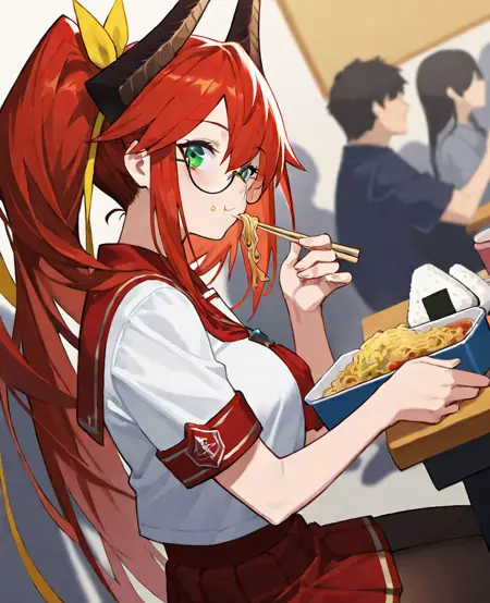 빨간 머리, 녹색 눈, 뿔, (측면) 폰테일, (노랑) 헤어 리본;