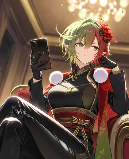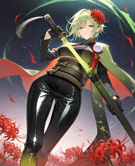 - ヘアリボン、髪の花(アサガオ)、イヤリング、ネックレス、高い襟、(グラデーション)カペレット、ポンポン\(衣装\)、(ラテックス)、黒いシャツ、広い袖、部分的に指なし手袋、サッシュ、黒いズボン、リボン;