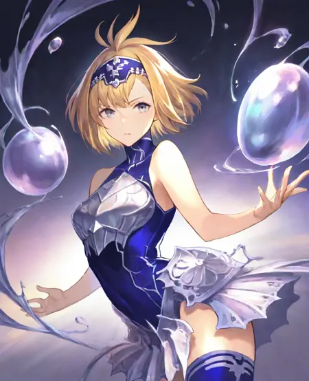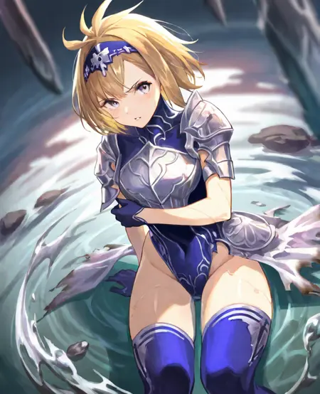 • 发带,高领,蓝色紧身衣,连体衣,无袖,护甲,胸甲,(肘部)手套,(腰披/护甲裙),蓝色过膝袜;