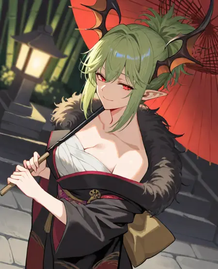 绿色头发,红色眼睛,尖耳朵,头部有翅膀,扎发 / 马尾;