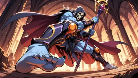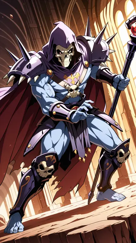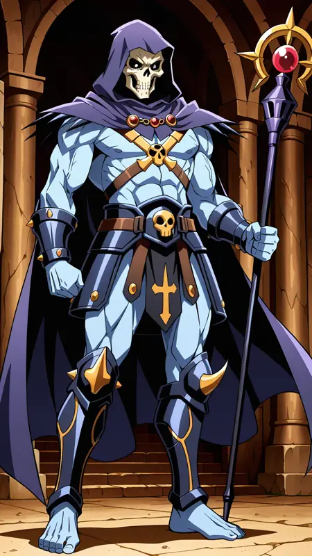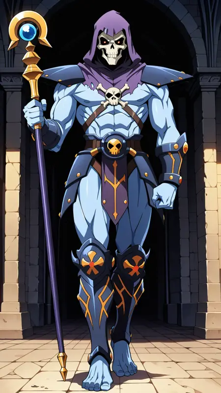 Skeletor200x, skull face, blue skin, hood, barefoot, leg armor, male, muscular, staff,