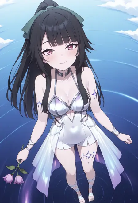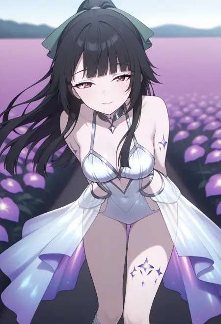 cha13v1,fantasy,ethereal,white bodysuit,sheer skirt,galaxy print,gradient fabric,bare legs,deep cleavage,bare feet,backless,exposed back,delicate straps,leg wraps,star motif,anime screencap