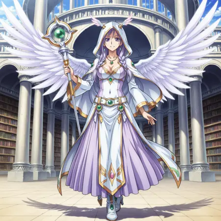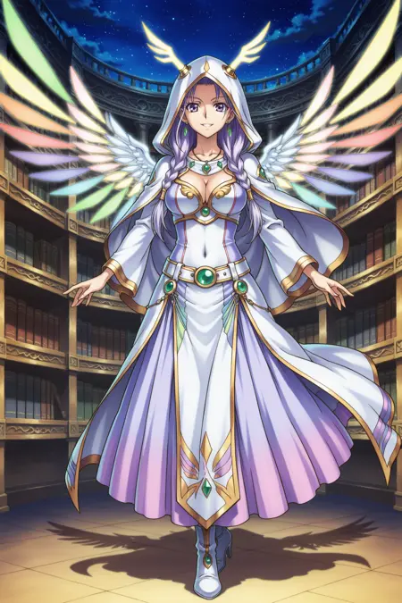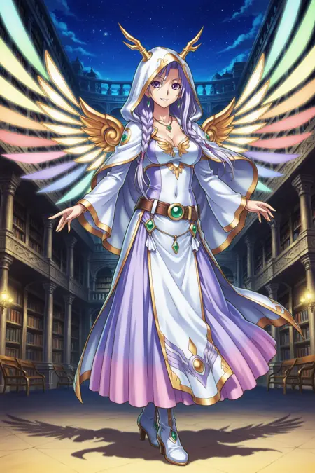 yugioh_card_style, yugioh_card_for_diviner_of_the_herald, 紫色の目, 淡紫色の髪, 長髪, 編み込み髪, ピアス, ネックレス, 大きな胸, 鎖骨, 裸のへそ, 胸元, 笑顔, フード付きローブ, 白いフード, 角のあるフード, 天体テーマの衣装, 多色のフリンジ, 石飾り, 流れるスカート, 天使的な衣装, アーマーの細部, パステル調のアクセント, 緑の石付きベルト, クリスタルアクセサリー, 天使の翼, 装飾的な staff, ハイヒールブーツ