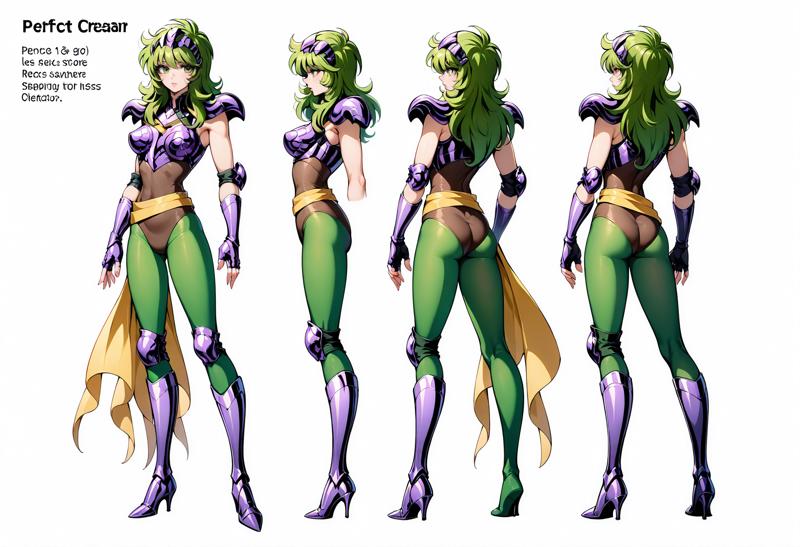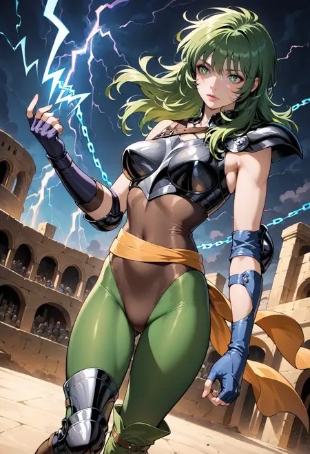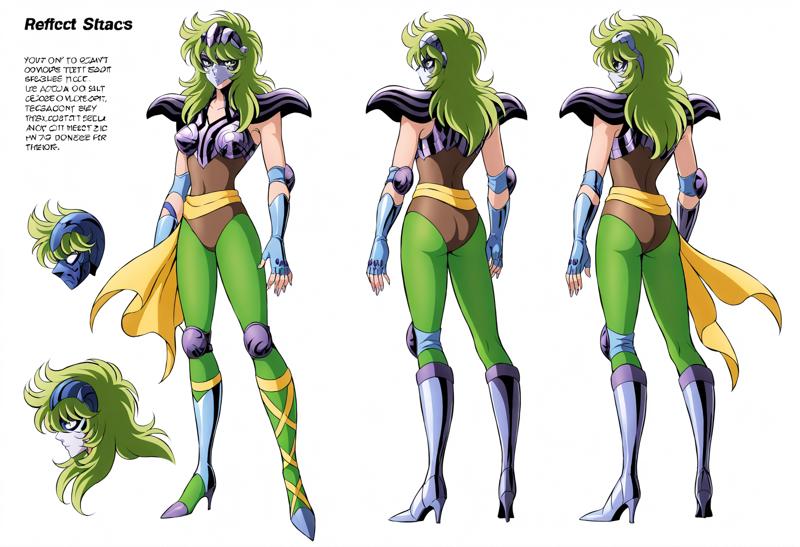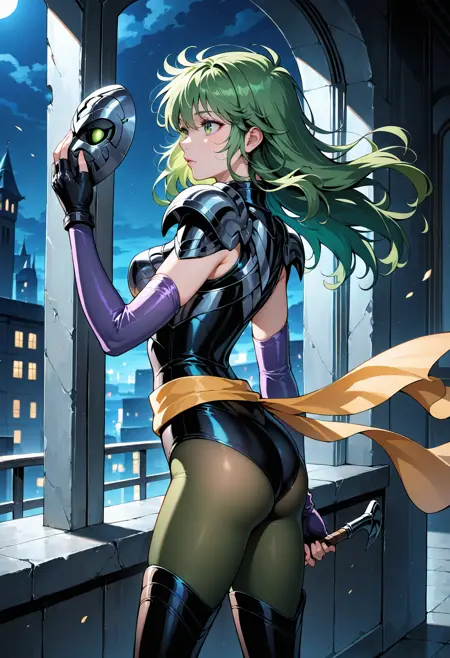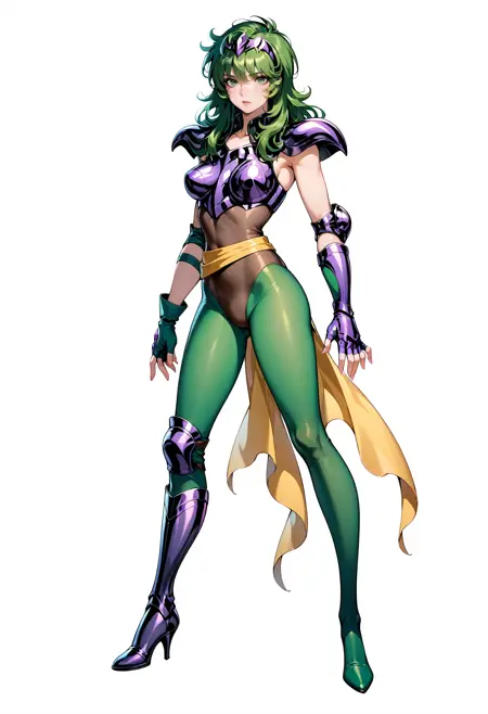 衣装: アーマー、手袋、指なし手袋、ハイヒール、ブーツ、肩パッド、肘グローブ、サッシュ、ハイヒールブーツ、肩甲部アーマー、パウドロン、パンティストッキング、太ももブーツ、胸、緑の目、緑の目アーマー、胸板、爪、膝パッド、ボディスーツ、ノースリーブ、レオタード、膝ブーツ、ベルト、片方のブーツ、緑のパンティストッキング、腕ガード、肘パッド、靴、ジュエリー、非対称な脚部装備、肌にフィット、装甲ブーツ、別衣装、肩出し