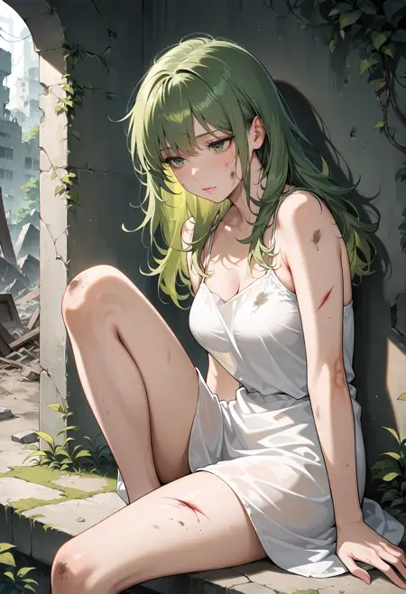 外見: 1girl、緑の髪、長い髪、前髪、中程度の胸