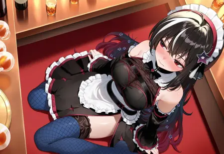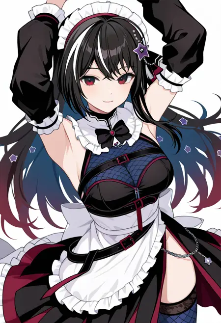 maid headdress, star hair ornament, black dress, fishnets, black bowtie, white apron, detached sleeves,multiple belts, chest belt, side slit, layered skirt, blue thighhighs, fishnet thighhighs